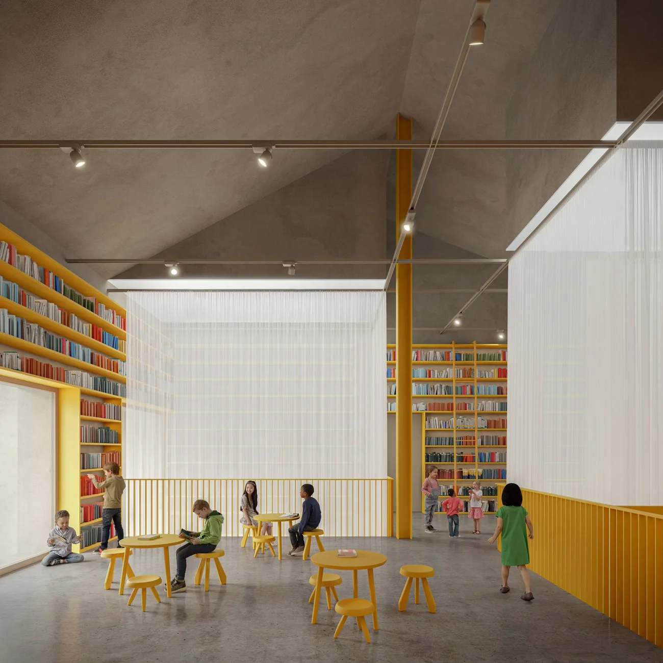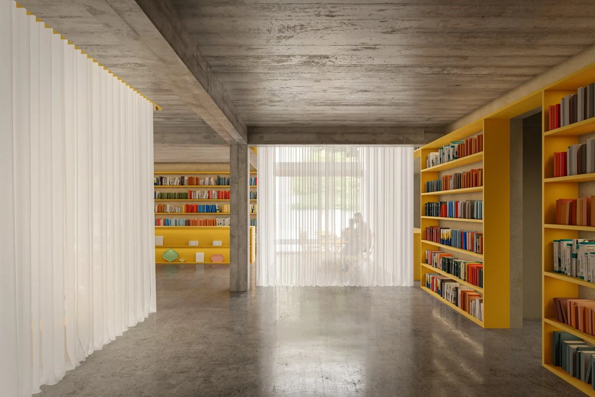 An agricultural warehouse in an urban center seeking to reinvent itself. Its materiality and scale are restored, its ancestral identity recovered. We clarify its design, revealing its inherent qualities. We design through light. Two generous skylights illuminate a central space, welcoming a community and encouraging interaction and sharing. The space is occupied in an ephemeral way, with furniture that introduces color and invites creativity and imagination. A new focal point emerges — a communal space, a Library for all.